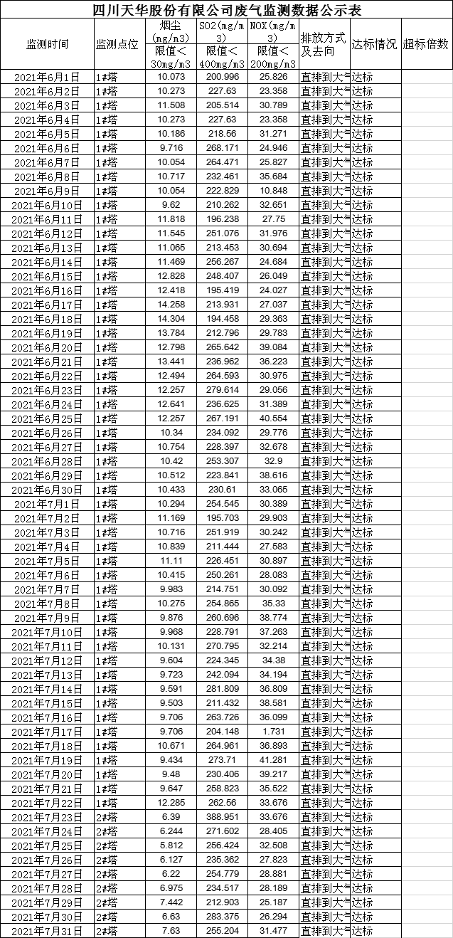 四川天華股份有限公司6月、7月廢氣監測公示