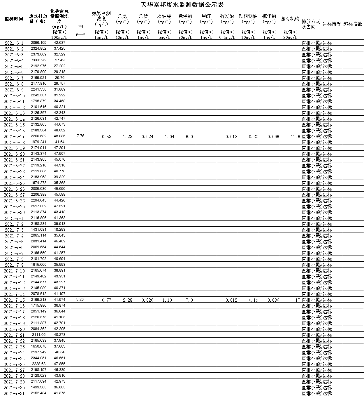 四川天華富邦化工有限責任公司6月、7月廢水監測數據公示